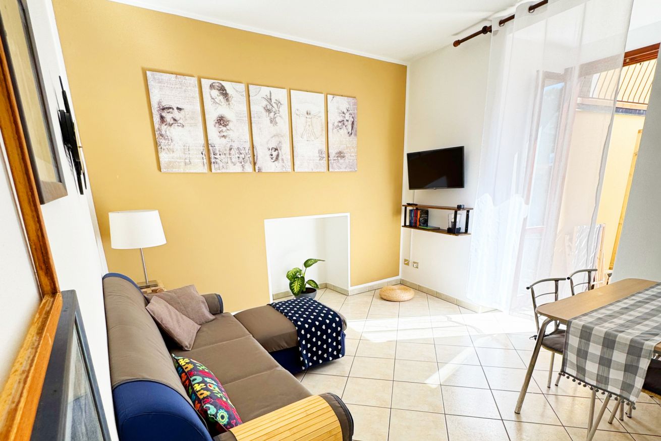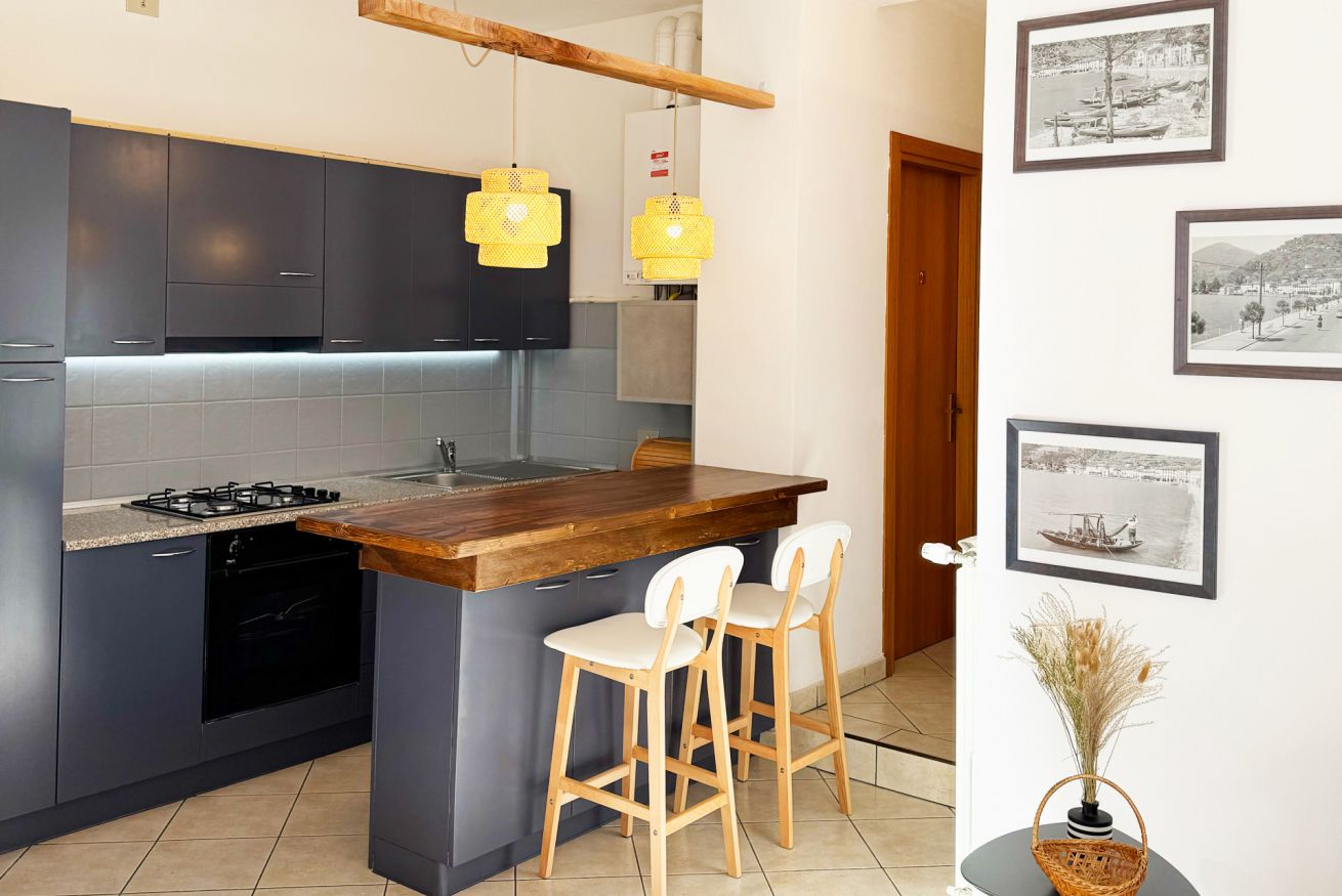 Trilocale di circa 65 mq situato al piano terra in corte ad uso comune. Cucina completamente attrezzata nell'area living all'ingresso, con divano e porta finestra con vista parziale a lago. Ampio bagno con doccia. Camera da letto patronale con letto matrimoniale e seconda camera con due letti singoli.