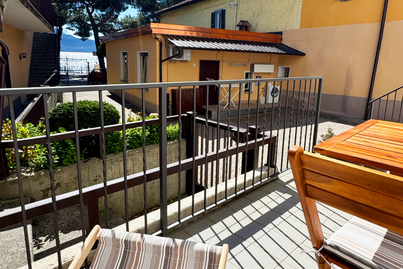 Terrazzino esterno privato, situato in cortile ad uso comune con vista lago parziale.
